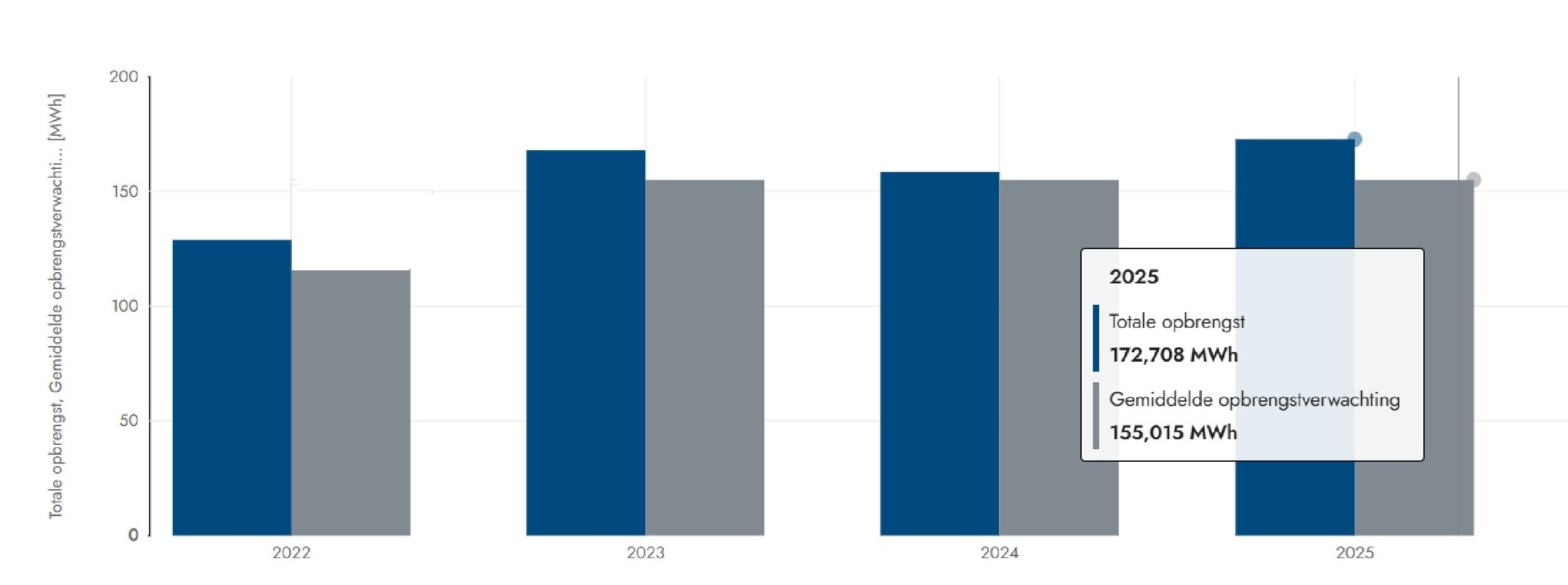 In 2025 is een record totaal van 172.708 kWh opgewekt.
